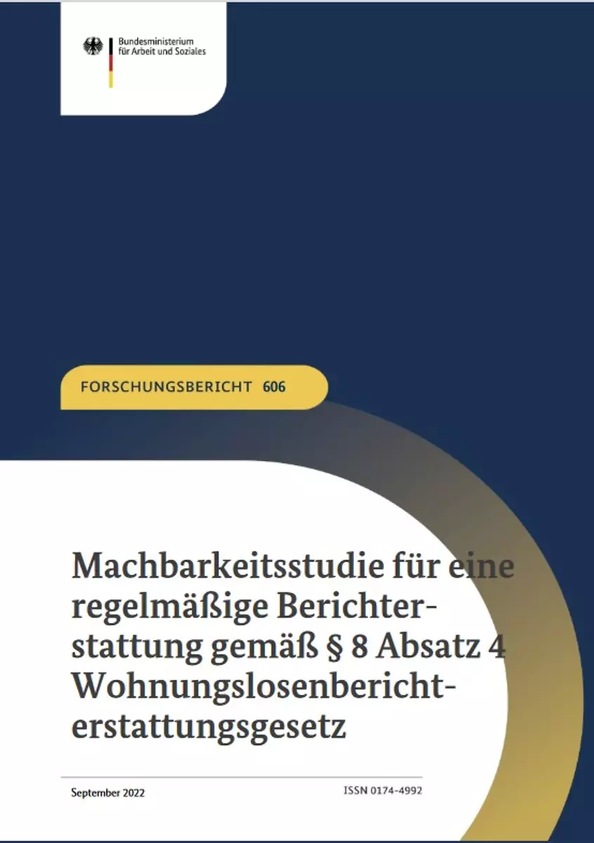 Die Machbarkeitsstudie zur Wohnungslosenberichterstattung (Forschungsbericht 606 des Bundesministeriums für Arbeit und Soziales) untersucht, ob und mit welchem Aufwand sich eine Berichterstattung über Formen der Wohnungslosigkeit realisieren lässt, die weder durch die neue Bundeswohnungslosenstatistik zu untergebrachten Wohnungslosen noch über die ergänzende empirische Erhebung zu wohnungslosen Menschen ohne Unterkunft und zu verdeckt Wohnungslosen erfasst sind. Die Studie orientierte sich an der für statistische Zwecke entwickelten European Typology of Homeless and Housing Exclusion (ETHOS Light) der europäischen Dachorganisation für die Wohnungslosenhilfe FEANTSA, die etwa Geflüchtete mit anerkanntem Schutzstatus, Personen, die ohne eigene Wohnung länger als notwendig im Gesundheitssystem oder in Haftanstalten verbleiben, und Personen in Institutionen des Gewaltschutzes zu den von Wohnungslosigkeit betroffenen Gruppen zählt. Für die genannten Gruppen waren die Möglichkeiten einer Berichterstattung zu prüfen. Ansatzpunkte für eine Verbesserung der Datengrundlage zu von Wohnungslosigkeit betroffenen Menschen in Deutschland suchte die Studie übergreifend in den Datenbeständen und Statistiken der Mindestsicherungssysteme und Verwaltungsregister. Sie unterbreitet Anregungen für die Berichterstattung über Querschnittsthemen und für qualitativ und quantitativ ausgerichtete Vertiefungsstudien.